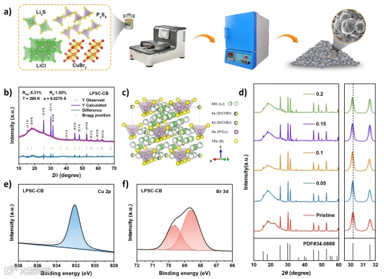 基于此,北京科技大学的范丽珍教授在在国际知名期刊Energy Storage Materials上发表题为“Engineering High-Performance Argyrodite Sulfide Electrolytes via Metal Halide Doping for All-Solid-State Lithium Metal Batteries”的研究论文。该文章通过多功能的CuBr2对富氯体系的硫银锗矿型硫化物电解质进行掺杂改性,同时实现了超高离子电导率和良好的空气稳定性。同时,该电解质匹配FeS2复合正极组装的全电池具有较高的放电比容量和良好的循环稳定性。