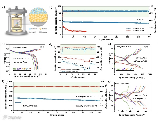 首先使用LiCoO2(LCO)作为正极活性材料来评估电解质的性能。LCO/LPSC-CB/Li电池在0.2C下的首圈放电比容量为112.6 mAh g−1,库仑效率为90.6%。在400次循环后容量保持率为86.7%。LCO/LPSC-CB/Li的可逆比容量在1 C的电流密度下可达88.6 mAh g−1,当电流密度降低到0.2 C时,放电比容量可以恢复到112.2 mAh g−1。为了开发高能量密度全固态电池,采用超高理论比容量的FeS2作为正极材料进行了实验。FeS2/LPSC-CB/Li电池在0.1 C下首圈实现了788.9 mAh g−1的高放电比容量和93.9%的库仑效率。该电池同时具有良好的倍率性能,这表明组装的全固态电池具有高度的可逆性。基于这些研究,我们认为LPSC-CB有助于制造具有高能量密度、安全性和长循环寿命的全固态锂电池。