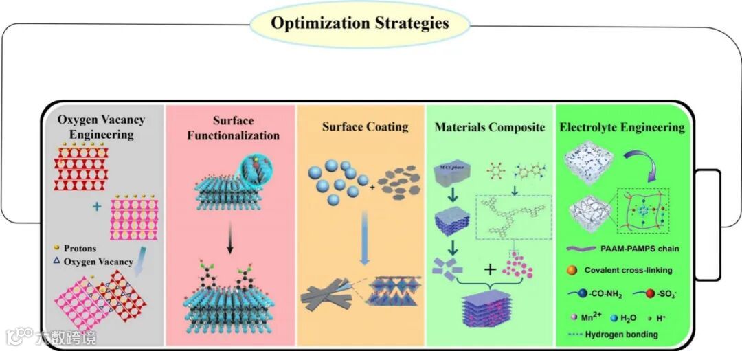 除此之外,论文还总结并分析了用于质子电池负极的改性策略的最新进展,如氧空位工程、表面功能化、表面涂层、材料复合以及电解液优化等。这些策略不仅能提高电极材料的电导性和反应活性,还能改善电极的结构稳定性,进而提升电池的整体性能。