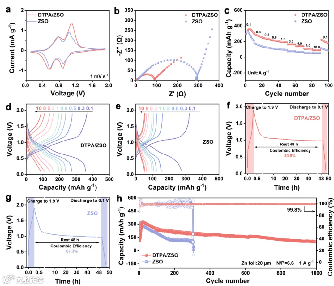 图5.全电池性能。(a) V2O5||Zn电池的循环伏安曲线。(b) 循环前的EIS图。(c) V2O5||Zn 全电池的速率性能,以及(d,e)使用 DTPA/ZSO 和ZSO电解质对应的充电/放电曲线。(f) DTPA/ZSO 和 (g) ZSO以1 A g-1完全充电至1.9V,然后电池静置48小时,接着完全放电至0.1V。(h) V2O5||Zn扣式电池在不同电解质中1 A g-1下的循环性能。