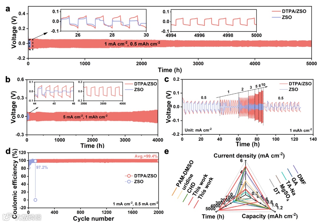 含有DTPA添加剂组装的Zn||Zn对称电池在1 mA cm-2和5 mA cm-2下能够稳定循环5000小时和4000小时,平均库伦效率高达99.4%。此外,在DTPA/ZSO中运行的V2O5||Zn 电池在1A/g的电流密度和低的N/P(6.6)下,循环 1000 次后仍能保持较高的容量保持率。