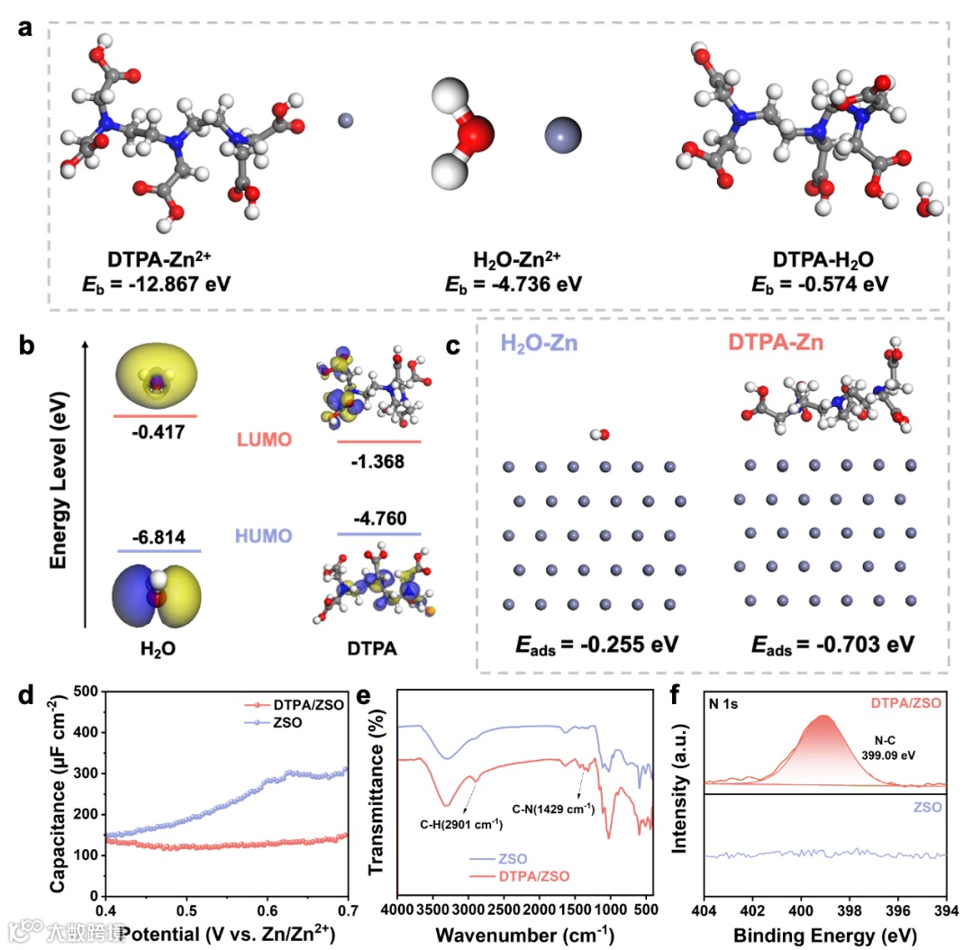 图2. DFT计算以及电解质成分与锌阳极之间相互作用的特征描述。(a)结合能。(b)H2O和DTPA的HOMO和LUMO能级。(c)H2O和DTPA在Zn金属表面的吸附能。(a)在DTPA/ZSO和ZSO电解液中收集的Zn||Cu电池的差分电容曲线。(b)锌箔在ZSO和DTPA/ZSO电解液中循环100次后的傅立叶变换红外光谱。(f)在电解质中循环100次后,锌箔的N 1s的高分辨率XPS光谱。