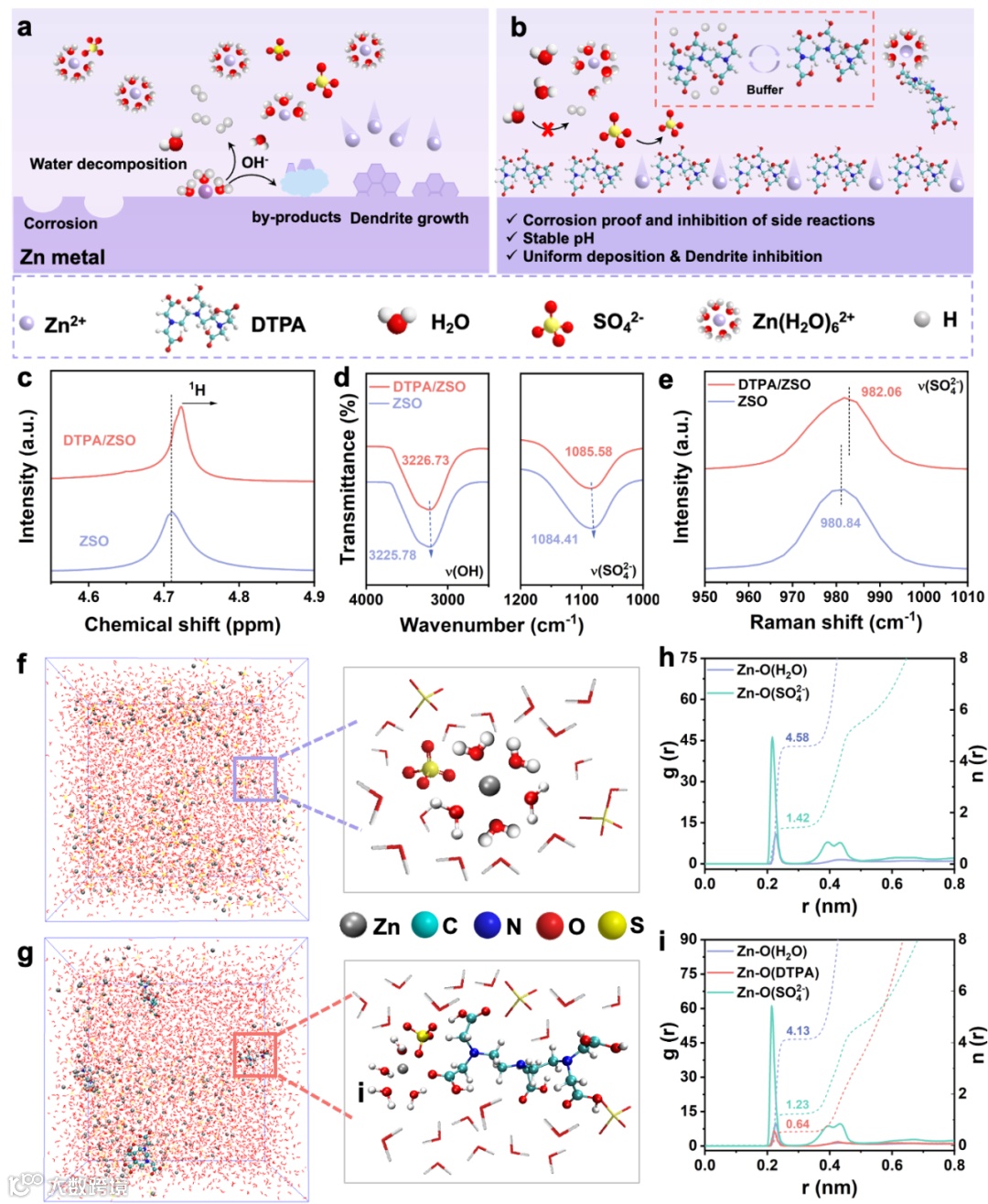 图1. DTPA的保护机制和溶剂化结构分析。(a) ZSO电解质和 (b) DTPA/ZSO电解质中锌沉积循环示意图。(c) ZSO和DTPA/ZSO的D2O的1H NMR光谱对比。(d) 含有和不含DTPA的ZSO电解质的傅立叶变换红外光谱和 (e) 拉曼光谱。(f) 不含DTPA的ZSO电解质和(g)含DTPA的ZSO电解质的分子动力学(MD)模拟快照。(h) ZSO电解质和(i)DTPA/ZSO 电解质中通过 MD 模拟收集的径向分布函数 (RDF)。