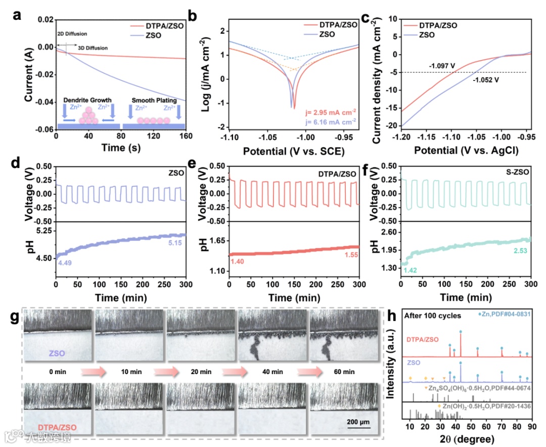 图3. DTPA添加剂关于抑制枝晶和副反应的电化学表征。(a) 在-150mV时Zn电极的计时安培曲线。(b) Tafel曲线。(c) LSV曲线。(d-e) 在5 mA cm-2循环条件下对称电池中ZSO、DTPA/ZSO和S-ZSO电解质的pH 监测。(g) 在10 mA cm-2条件下,记录不同时间的锌沉积原位光学可视化观测结果。(h) XRD图谱。
