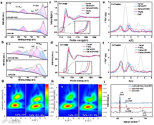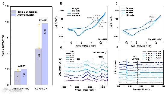 含氧中间体OOH* 的快速质子化为动力学快速 OER 过程的关键。原位光谱证明了表明抑制CoFe-LDH-NO2−中的铁膨胀增强了活性中心对羟基(OH)的吸附,促进了*OOH中间体的形成。因此,CoFe-LDH-NO2− 表现出更快的四电子 OER 动力学过程和增强的催化性能。