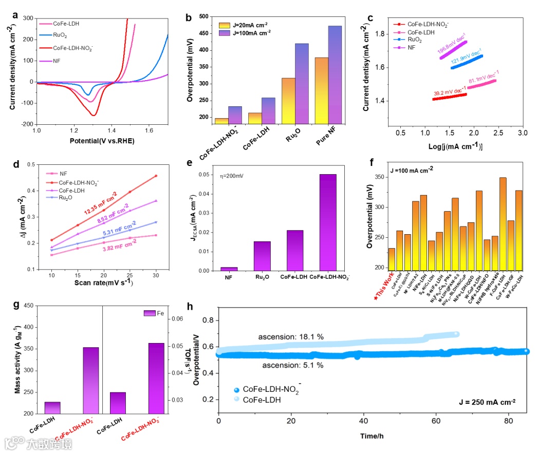 碱性水电解的效率受到阳极处缓慢的四电子-质子耦合的显著限制,因此其在一定电流密度下需要很大的过电势,CoFe-LDH-NO2− 提供 186 mV 和 233 mV 的最低过电位,最高可达 10 和 100 mA cm-2。CoFe-LDH-NO2− 表现出显著的运行稳定性,在连续 100 小时的 OER 中保持约 250 mA cm-2 的电流密度。