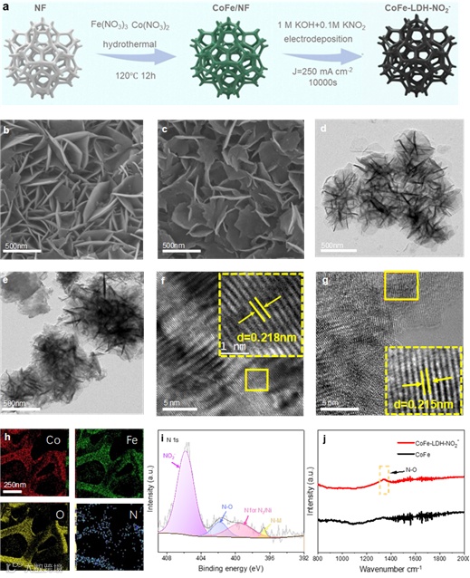 氢能因其在大规模储能、清洁燃烧和可再生能源方面的潜力而成为绿色能源领域的领先竞争者。电化学碱性水电解是大规模生产超纯氢的最有前途的方法之一。近年来,LDHs因其超薄的层状结构、可调谐的宿主层和中间层以及优异的电催化活性而成为一种很有前途的OER催化剂。然而,由于活性金属的偏析,LDH 的稳定性在大电流条件下和长时间运行时可能会变差。例如,由于铁偏析,典型的 NiFe-LDH 材料在高电流密度下经常面临性能下降。因此,迫切需要设计新型 LDH 材料,以抑制高电流密度作期间的金属偏析。为了解决上述问题,一种亚硝酸盐离子 (NO2−) 掺杂策略,使用原位生长和电沉积技术,成功抑制 Fe 偏析,从而提高 OER 在大电流下的稳定性。