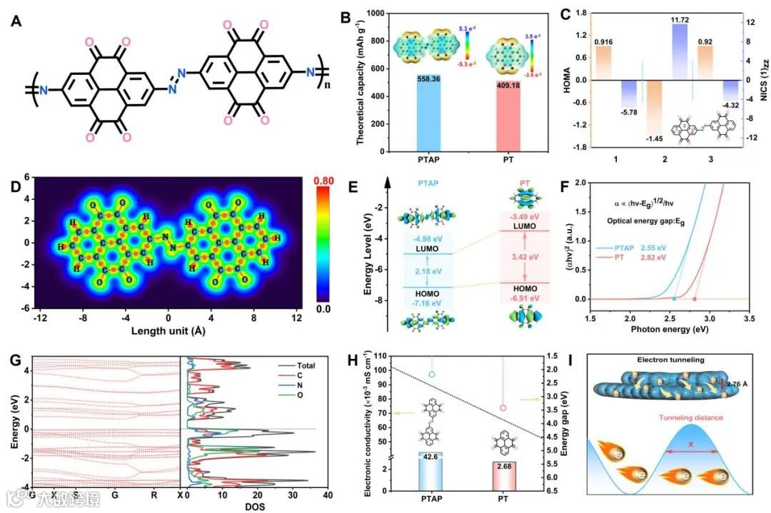 PTAP是由共轭4,5,9,10-芘四酮分子通过活性偶氮基团连接的一种聚合物。ESP结果显示,除C=O基团外,N=N基也可以作为氧化还原反应的活性位点,从而避免了非活性组分的引入。芳香性分析表明,PTAP分子中存在广泛的共轭和电子离域,同时分子的HOMO和LUMO能级表征也证实PTAP具有低能隙,有利于促进电子的快速传导。因此,PTAP表现出更高的电子导电性,其电导率达到4.2×10-3 S m-1,远高于国际上已报道的大多数有机材料。