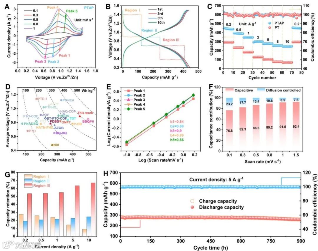 以PTAP为阴极组装的锌有机电池,在0.2 A g-1电流下表现出442.45 mAh g-1的高比容量。即使在10 A g-1的高电流密度下,PTAP的比容量仍能保持248.61 mAh g-1。除了氧化还原动力学外,该电池还表现出了突出的循环稳定性:在1 A g-1电流密度下循环240小时后容量几乎不衰减,在5 A g-1充放电循环900小时后容量保持率约为92.14%。
