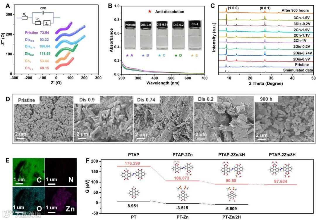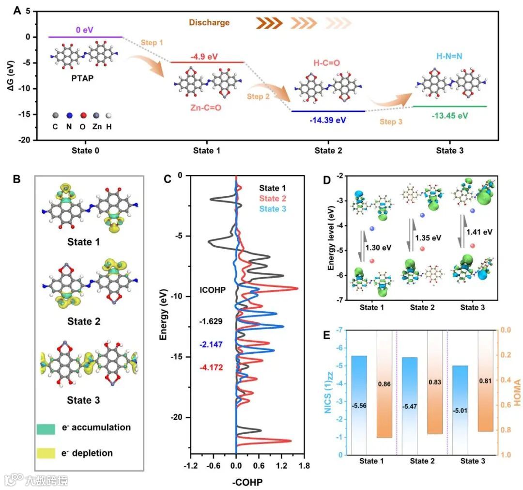 ESP结果显示,除了C=O基团外,N=N基也可作为氧化还原反应的活性位点,从而避免了非活性组分的引入。PTAP放电过程是三步连续的电荷储存。首先是C=O位点参与拥有4电子转移的Zn2+插入过程;其次是由C=O和N=N位点贡献的4电子转移的质子储能过程;充电过程分别对应8电子脱氢和4电子脱锌。总的储能过程表现为:Zn2+和H+双离子共插入C=O和N=N位点,并伴随12电子转移的多步耦合机制,因此展现出较高的储存容量。