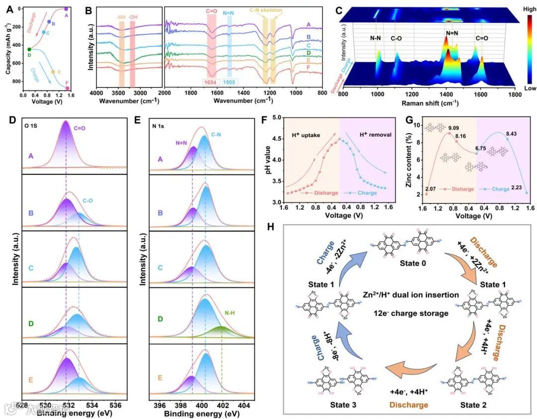 为了揭示电荷储存过程,采用FT-IR、XPS和拉曼表征来研究PTAP阴极在不同电压下的结构状态。结果显示,放电过程为PTAP阴极引发的三步连续电荷储存。首先是C=O位点参与拥有4电子转移的Zn2+插入过程;其次是由C=O和N=N位点贡献的4电子转移的质子储能过程。其中两步质子耦合为快速的氧化还原储能过程,并提供74.5%的高容量占比。充电过程分别对应8电子脱氢和4电子脱锌步骤,具有高度的氧化还原可逆性。总的储能过程表现为Zn2+和H+双离子共插入C=O和N=N位点,并伴随12电子转移的多步耦合机制,并展现出高的储存容量和快的氧化还原动力。
