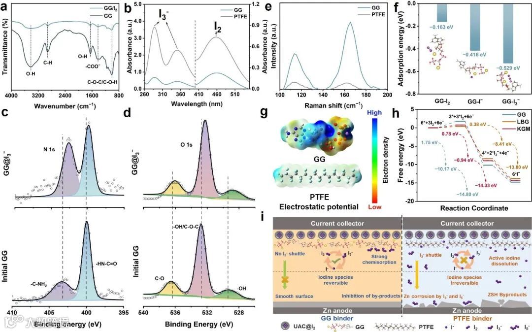 图1(a)GG粘结剂吸附多碘化物溶液前后的FT-IR光谱;(b)GG和PTFE与I3−(左)和I2(右)溶液混合后的紫外-可见吸收光谱;(c,d)GG@I3−与GG N 1s,O 1s精细光谱的XPS图;(e)GG和PTFE粘结剂吸附多碘化物溶液前后的拉曼光谱;(f)理论模型计算得到了GG单体与碘物种(I2、I−和I3−)相互作用的最佳吸附构型和相应结合能;(g)GG和PTFE分子的静电势分布;(h)热力学分析了不同粘结剂间顺序自由基反应的吉布斯自由能值;(i)GG和PTFE粘结剂对载碘正极和锌负极的作用机制示意图。