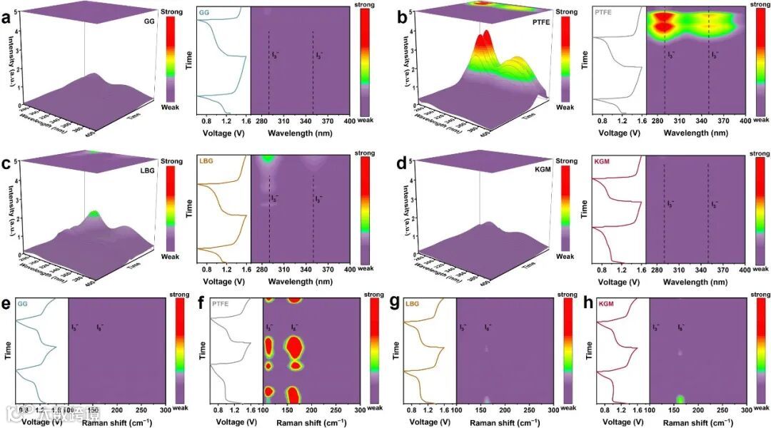 图5 UAC@I2正极采用(a)GG,(b)PTFE,(c)LBG和(d)KGM粘结剂充放电过程中的原位紫外-可见吸收光谱;UAC@I2正极采用(e)GG,(f)PTFE,(g)LBG和(h)KGM粘结剂充放电过程中的原位拉曼光谱。