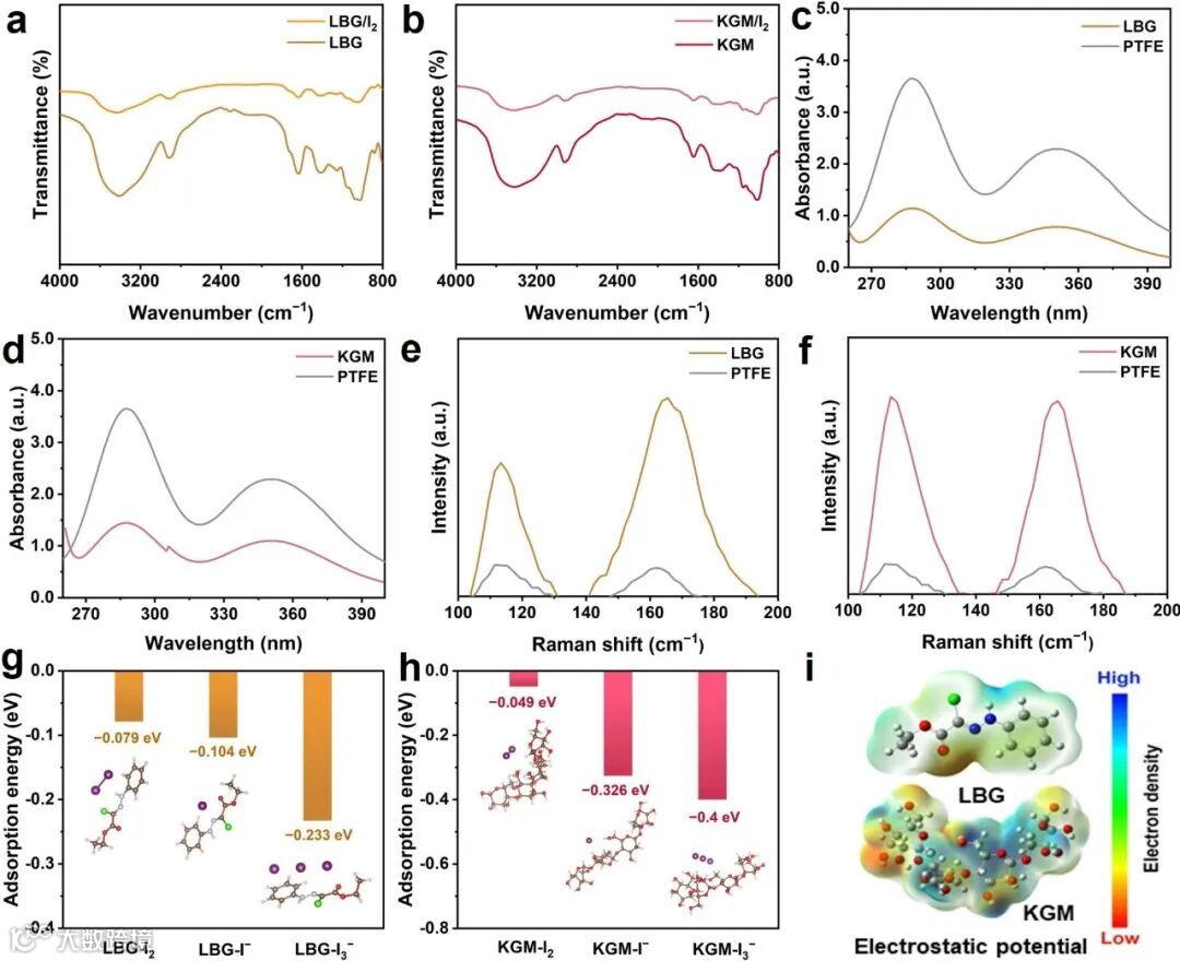 图2(a)LBG粘结剂和(b)KGM粘结剂吸附相应浓度多碘化物溶液前后的FT-IR光谱;(c)与PTFE粘结剂相比,LBG和(d)KGM粘结剂与I3−溶液混合后的UV-vis光谱;(e)LBG和(f)KGM粘结剂吸附多碘化物溶液前后的拉曼光谱;(g)理论模型计算得到了LBG单体和(h)KGM单体与碘物种(I2、I−和I3−)相互作用的最佳吸附构型和相应结合能;(i)LBG和KGM分子的静电势分布。