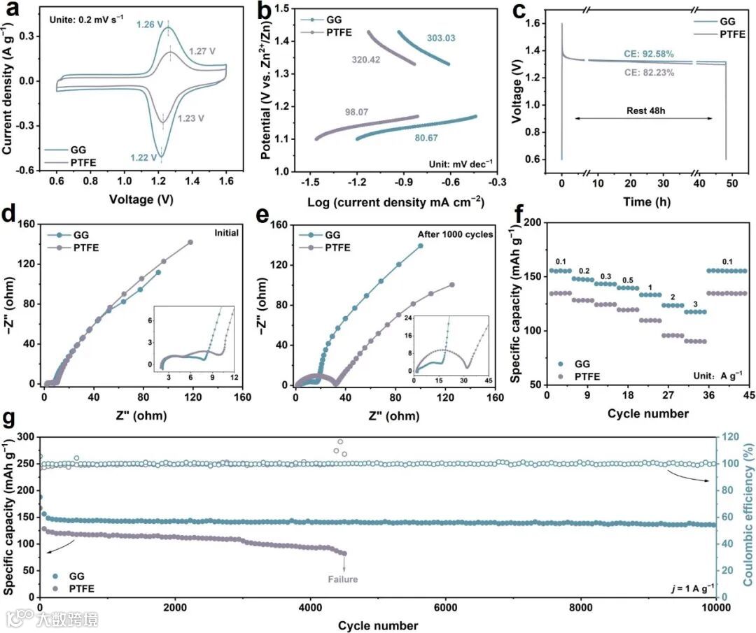 图3(a)在扫描速率为0.2 mV s−1时,采用GG和PTFE粘结剂Zn//UAC@I2全电池的循环伏安曲线;(b)拟合计算得到采用GG和PTFE粘结剂Zn//UAC@I2全电池在对应循环伏安法极化部分曲线的Tafel斜率;(c)采用GG和PTFE粘结剂Zn//UAC@I2全电池的抗自放电能力比较;采用GG和PTFE粘结剂Zn//UAC@I2全电池在1000次循环前(d)后(e)的EIS光谱;(f)采用GG和PTFE粘结剂Zn//UAC@I2全电池在电流密度0.1、0.2、0.3、0.5、1、2和3 A g-1下的倍率性能;(g)采用GG和PTFE粘结剂Zn//UAC@I2全电池在电流密度1 A g-1下的长循环稳定性测试(10000次循环)。