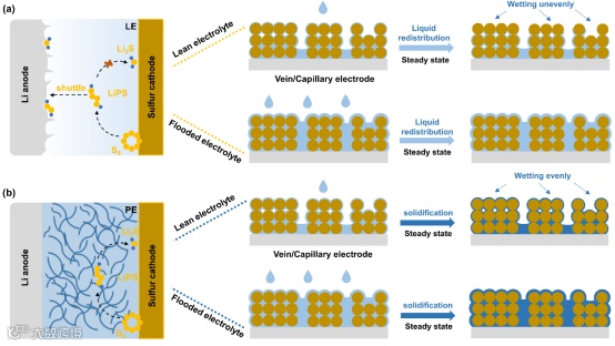 图1. 锂硫电池在贫液和富液条件下工作特点:(a)液态电解质,(b)准固态电解质。
