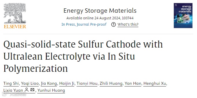 近日,来自华中科技大学的袁利霞教授在国际知名期刊Energy Storage Materials上发表题为“Quasi-solid-state Sulfur Cathode with Ultralean Electrolyte via In Situ Polymerization”的研究性论文。该论文报道了原位聚合的固态电解质可以有效降低锂硫电池的液/硫比。