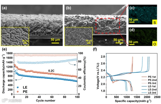 得益于准固态电解质对多硫离子的限制作用,金属锂与多硫化物、电解质之间的副反应消耗程度被大大减小,可以实现锂硫在超贫液(E/S=1 μL mg-1)下的正常放电,并且可以在(E/S=3 μL mg-1)的条件下进行循环。严格的贫液测试条件,对锂硫电池研究领域显得十分重要。