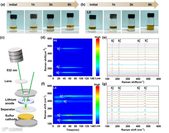 图2. 准固态电解质对多硫离子的穿梭抑制:(a)液态电解质的静置测试,(b)准固态电解质的静置测试。(c)原位拉曼测试示意图,(d-e)液体电解液的原位拉曼测试结果,(f-g)准固态的原位拉曼测试结果。