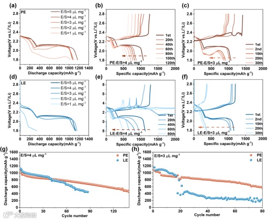 图4. 锂硫电池在贫液条件下的电化学性能:(a-c)准固态电解质,(d-f)液态电解质下的不同电解液添加量的充放电曲线。电池的在不同贫液条件下的循环性能对比:(g)E/S=4 μL mg-1,(h)E/S=3 μL mg-1。