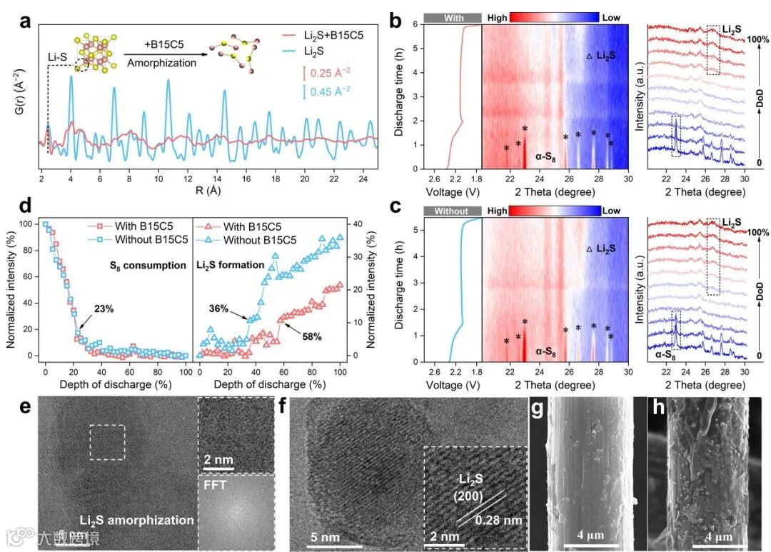 通过同步辐射对分布函数(PDF)分析和原位XRD表征,揭示了B15C5对Li2S沉积结构的调控机制。纯Li2S呈现尖锐的远程序列峰(>25 Å),而Li2S+B15C5体系则表现为无序振荡峰,表明长程有序性显著下降,证实非晶化主导。原位XRD监测表明,B15C5显著延迟Li2S晶核形成阈值(从DoD=36%延至58%),并抑制晶相生长速率,最终Li2S以非晶态为主、含微量纳米晶的复合结构沉积。非晶Li2S的无序特性消除了晶界应力,使其在导电基底上实现均匀连续覆盖,避免孔道阻塞并缩短Li+扩散路径。