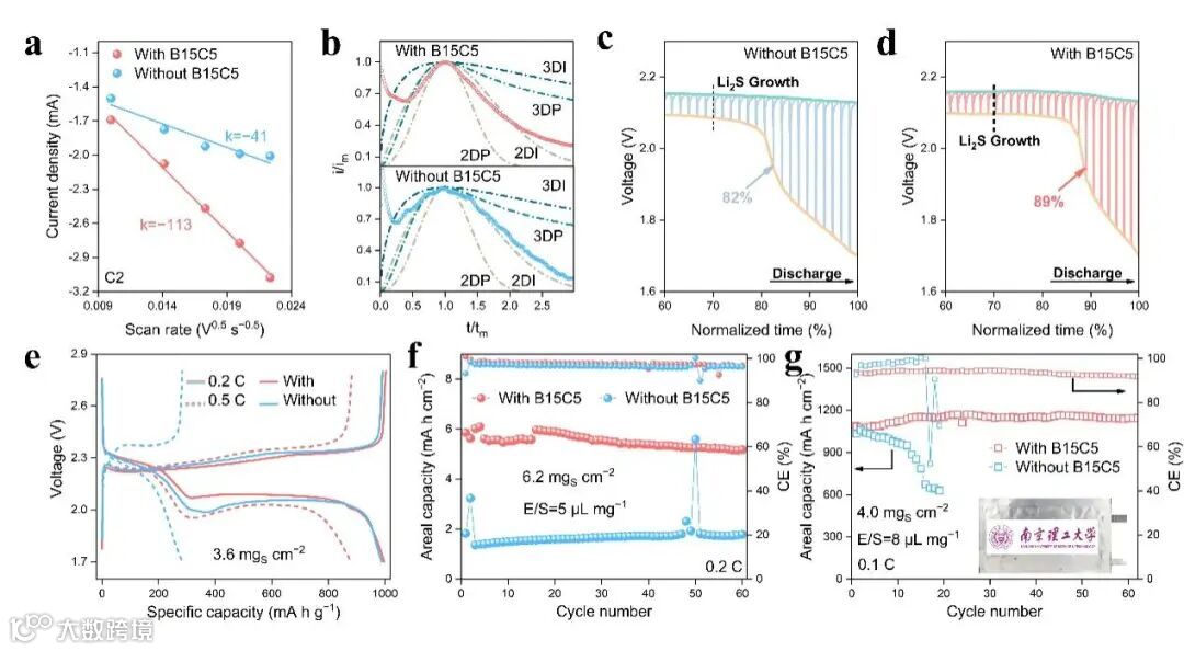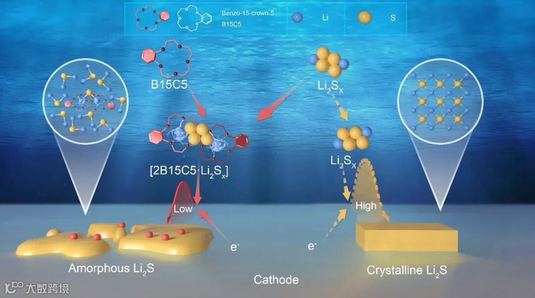 图1. 有和没有B15C5的Li-S电池反应机制的示意图。