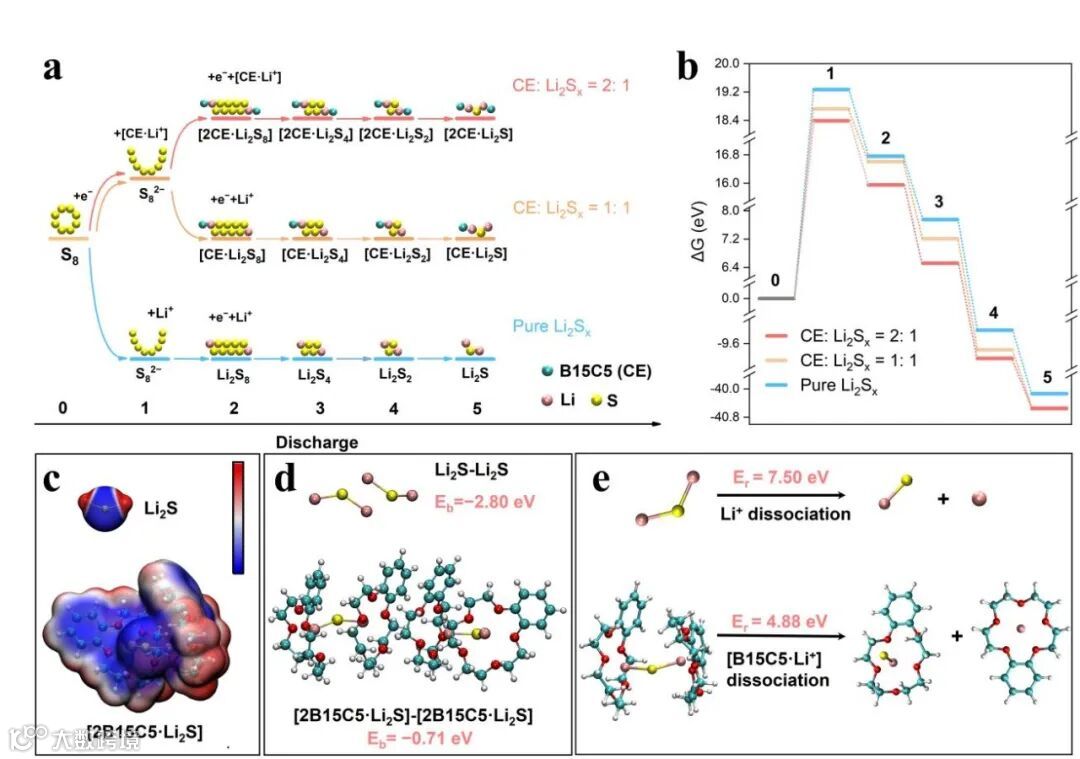 理论研究表明,B15C5通过双机制协同作用调控Li-S体系性能:其一,B15C5与Li+形成稳定溶剂化结构,其空间屏蔽效应抑制Li2S分子间作用,阻断晶体有序生长,驱动非晶化;其二,B15C5与多硫化物复合优化其电子结构,增强电子转移能力并降低Li2S中Li-S键解离能,从而突破反应能垒。物理屏蔽与电子调控的协同作用不仅抑制晶体成核,还加速多硫化物转化,为非晶态Li2S形成及高效动力学提供理论支撑。
