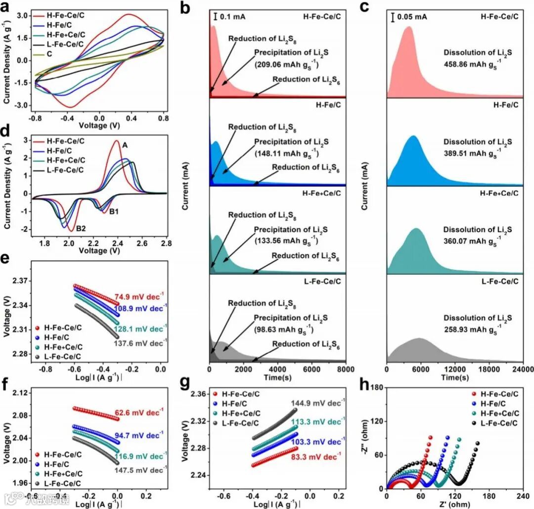 图4. 不同Fe2O3-CeO2异质材料组装的Li-S电池的电化学性能对比