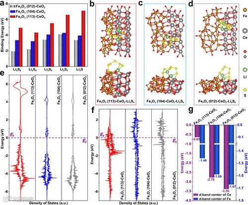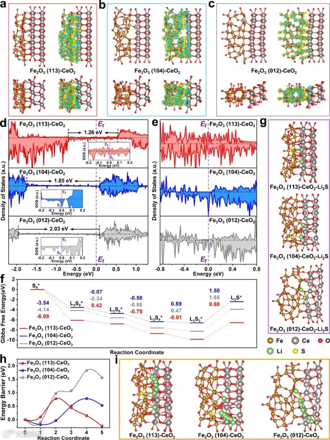 密度泛函理论(DFT)计算证实Fe2O3(113)–CeO2界面与多硫化锂分子和Li2S分子的结合能最负,其次是Fe2O3(104)–CeO2界面,而Fe2O3(012)–CeO2界面与多硫化锂分子和Li2S分子的结合能最靠近0,表明Fe2O3(113)–CeO2和Fe2O3(104)–CeO2界面比Fe2O3(012)–CeO2界面能更有效地吸附硫物种。态密度分析显示,相比较Fe2O3(012)–CeO2界面,Fe2O3(113)–CeO2和Fe2O3(104)–CeO2界面上的Fe原子和Ce原子的d带中心都更靠近费米能级,因而Fe2O3(113)–CeO2和Fe2O3(104)–CeO2界面显示出比Fe2O3(012)–CeO2界面更优的吸附性能 (图5)。