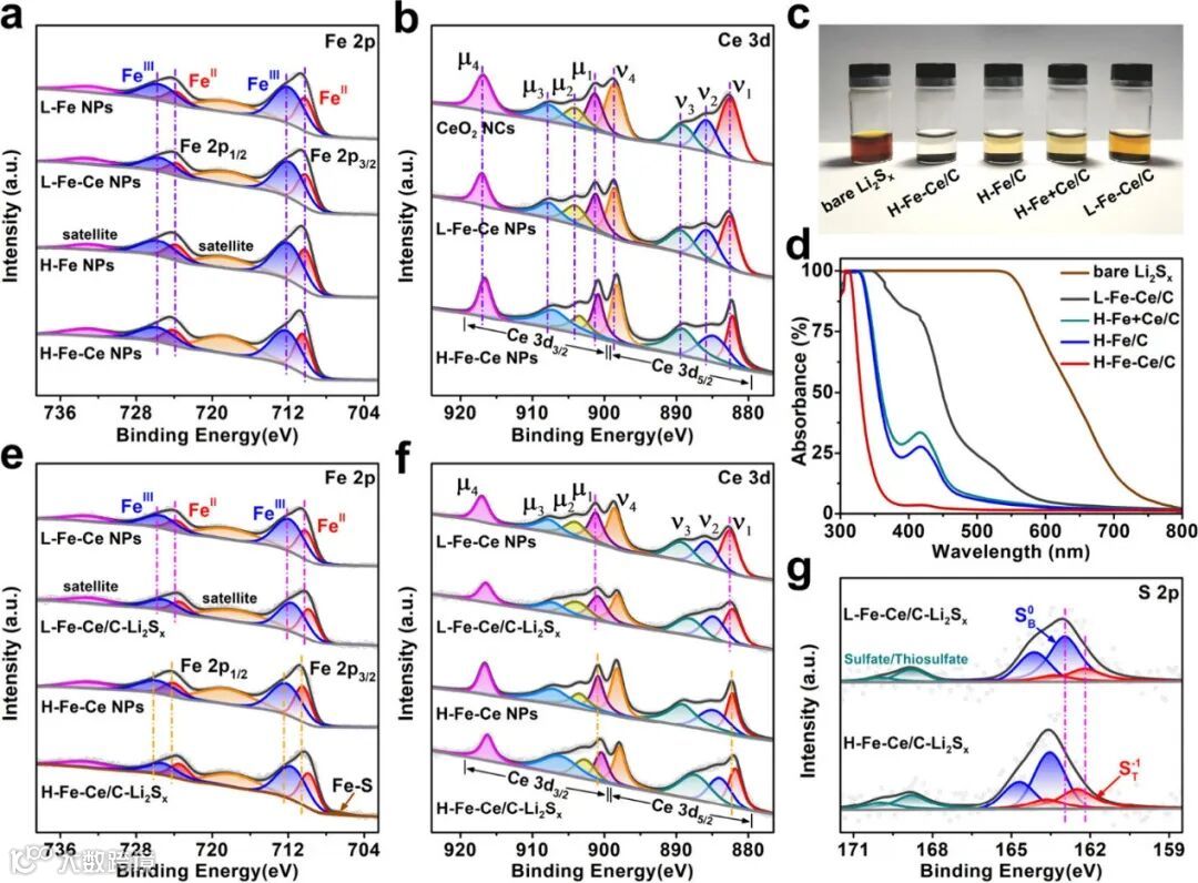 图2. 不同Fe2O3-CeO2异质材料吸附多硫化锂前后的XPS分析及吸附性能对比