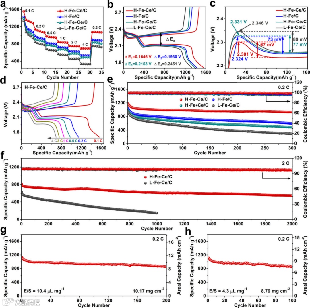 Li-S电池的电化学性能测试结果显示,以具有高能Fe2O3-CeO2界面的Fe2O3-CeO2异质材料作为电催化剂的电池在0.1 C下的初始放电比容量达到了1559 mAh g-1,明显高于以含有普通Fe2O3-CeO2界面的Fe2O3-CeO2异质材料作为催化剂组装的电池。同时,以具有高能界面的Fe2O3-CeO2异质材料作为电催化剂的电池展示出更优的倍率性能,并且在小电流密度和大电流密度下都具有更出色的循环稳定性,特别是在2.0 C下展现出长达2000次的出色循环性能,每次循环的平均容量衰减低至 0.016%。而且,硫含量高达10.17 mg cm-2的Li-S电池在0.2 C下可稳定循环200 次。即使将电解质/硫(E/S)比率降至4.3 μL mg-1,硫含量高达8.79 mg cm-2的电池在循环100 次后仍能保持7.53 mAh cm-2的面积容量(图4)。