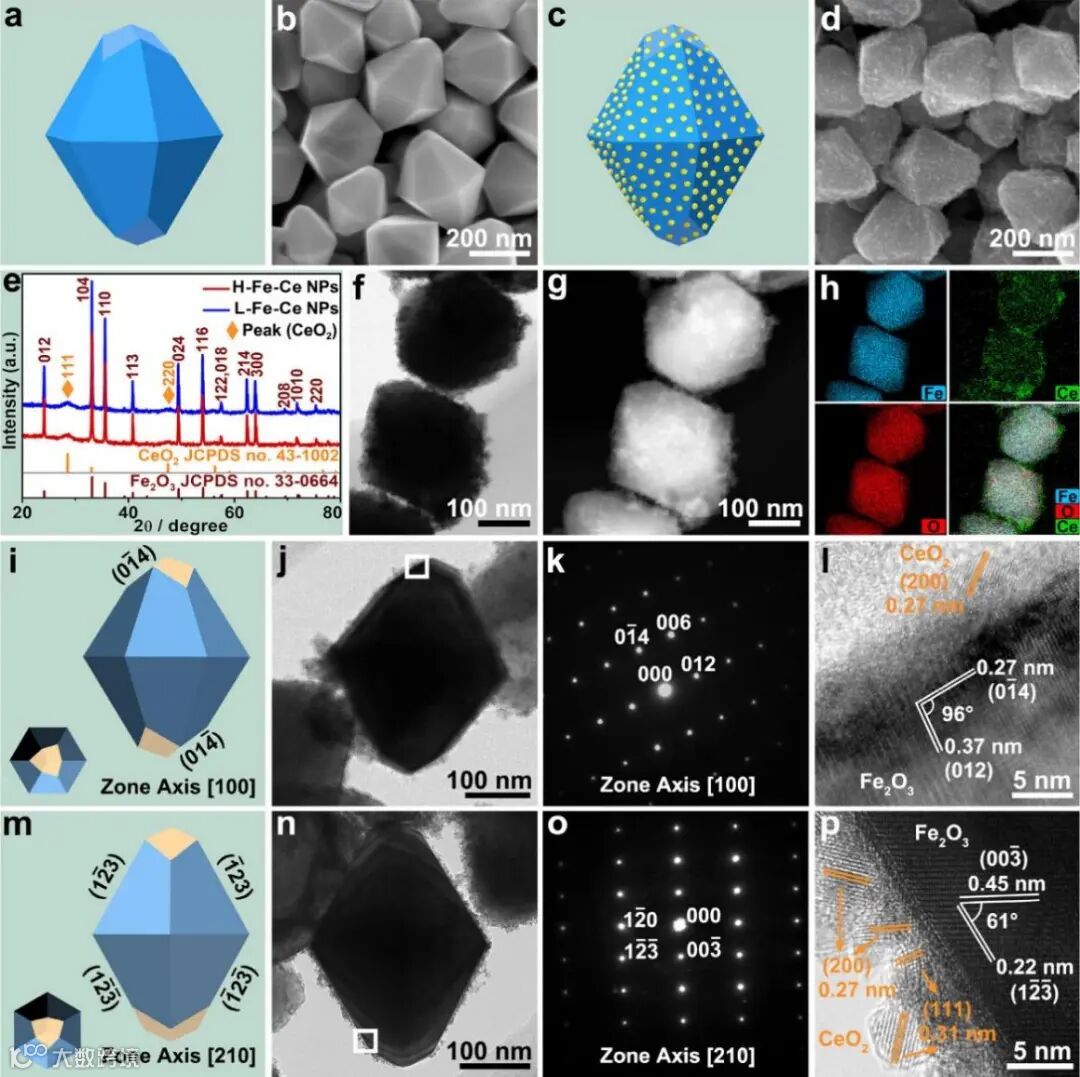 首先通过水热反应合成两种暴露晶面不同的Fe2O3纳米颗粒(Fe2O3纳米十八面体和Fe2O3类立方体,H-Fe NPs和L-Fe NPs),然后通过小尺寸的CeO2纳米晶在Fe2O3纳米十八面体和Fe2O3类立方体表面的异质生长,制备了Fe2O3-CeO2纳米十八面体(H-Fe-Ce NPs)和Fe2O3-CeO2纳米类立方体(L-Fe-Ce NPs)两种异质结构材料。扫描电镜(SEM),XRD和透射电镜(TEM)分析不仅证实了两种不同Fe2O3-CeO2异质纳米材料的成功合成,也解析了两种Fe2O3-CeO2异质纳米材料上所形成的不同Fe2O3-CeO2界面(图1)。当CeO2纳米晶异质生长在靠近Fe2O3纳米十八面体两顶点的六个归属于{104}晶面族的Fe2O3晶面上得到了Fe2O3(104)–CeO2界面,而生长在Fe2O3纳米十八面体中部八个归属于{113}晶面族的Fe2O3晶面上得到了Fe2O3(113)–CeO2界面。Fe2O3类立方体表面暴露了12个归属于{012}晶面族的Fe2O3晶面,CeO2纳米晶异质生长后得到了Fe2O3(012)–CeO2界面。