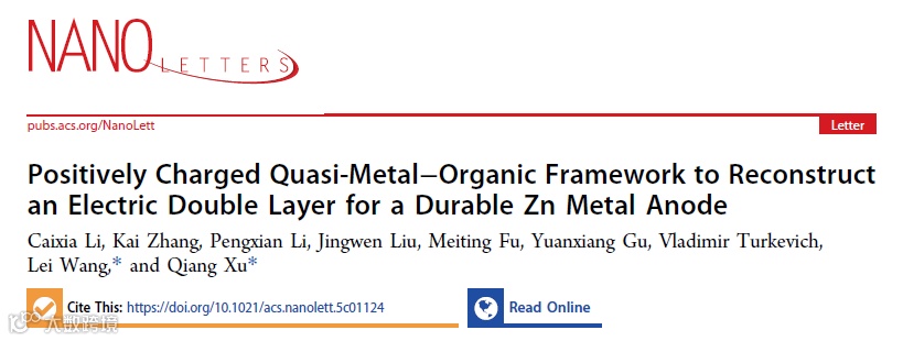 李彩霞副教授、王磊教授、徐强教授,Nano Letters:准金属有机框架调控界面双电层结构获得稳定锌负极