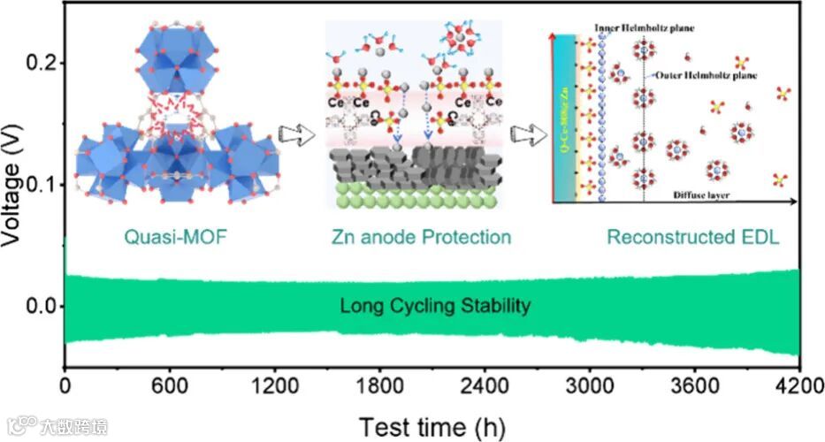 图1. Q-Ce-808锌负极保护机理及对称电池长循环测试。