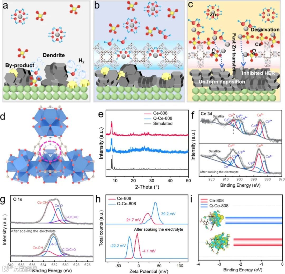 图2. (a)裸锌负极界面反应;(b)Ce-808结构制备人工SEI保护效果;(c)Q-Ce-808保护下锌负极界面反应;(d)Q-Ce-808配体缺失示意图;(e)XRD结果;(f-h)XPS测试结果(i)DFT计算吸附能。