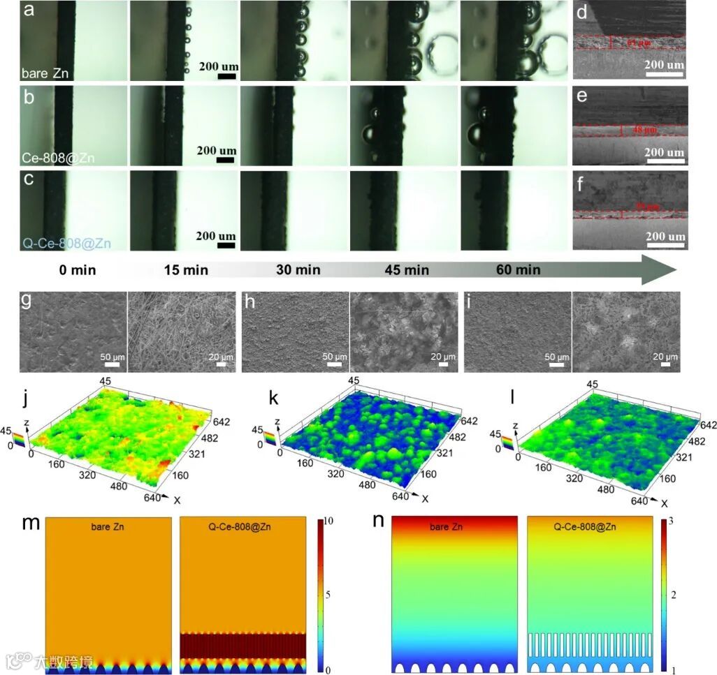 图3. 原位显微镜观察(a)裸锌负极,(b)Ce-808@Zn,(c)Q-Ce-808@Zn;电镀之后SEM图像(d)裸锌负极,(e)Ce-808@Zn,(f)Q-Ce-808@Zn;循环前后SEM(g)裸锌负极,(h)Ce-808@Zn,(i)Q-Ce-808@Zn;激光共聚焦显微镜(j)裸锌负极,(k)Ce-808@Zn,(l)Q-Ce-808@Zn;COMSOL模拟结果(m)电场分布,(n)锌离子分布。