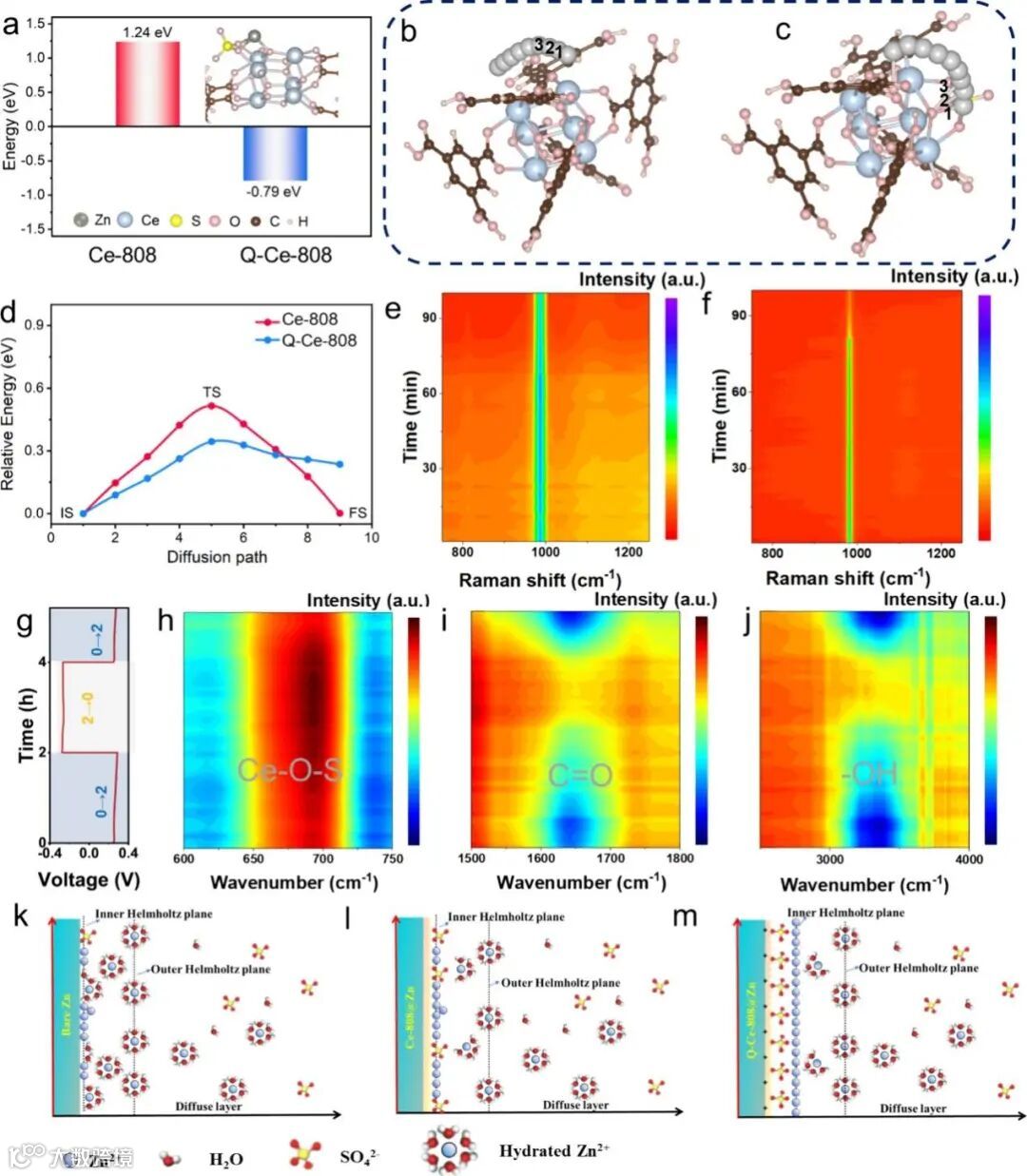 图4. (a-d) DFT计算表面吸附能与转移路线、迁移能垒。(e) Q-Ce-808@Zn和(f)裸锌负极极在2 M ZnSO4电解液中镀锌的原位拉曼结果。(g-j)对称电池的循环曲线和对应的Q-Ce-808@Zn负极的原位FT-IR曲线。(k)裸锌、(l) Ce-808@Zn和 (m) Q-Ce-808@Zn的EDL结构示意图。