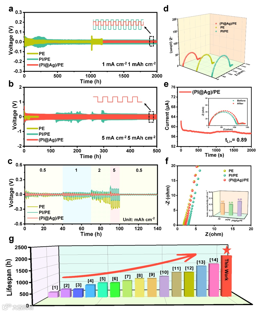 对(PI@Ag)/PE隔膜在不同电流密度下进行锂的电镀剥离测试,我们发现(PI@Ag)/PE隔膜能够在1 mAh cm-1的低电流密度下以较低的过电位稳定循环2000h;并且在5 mAh cm-1的高电流密度下稳定循环500h,没有明显的过电位变化,而纯PE隔膜由于非极性的表面和不均匀的孔洞出现了明显的电压波动,表明不断地有枝晶生成刺穿SEI膜。通过界面阻抗和锂离子迁移数的测试也间接的证明了上述结果。