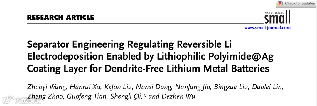 Zhaoyi Wang, Hanrui Xu, Kefan Liu, Nanxi Dong, Nanfang Jia, Bingxue Liu, Daolei Lin, Zheng Zhao, Guofeng Tian, Shengli Qi,* and Dezhen Wu. Separator Engineering Regulating Reversible Li Electrodeposition Enabled by Lithiophilic Polyimide@Ag Coating Layer for Dendrite-Free Lithium Metal Batteries. Small, 2025, 2504870.