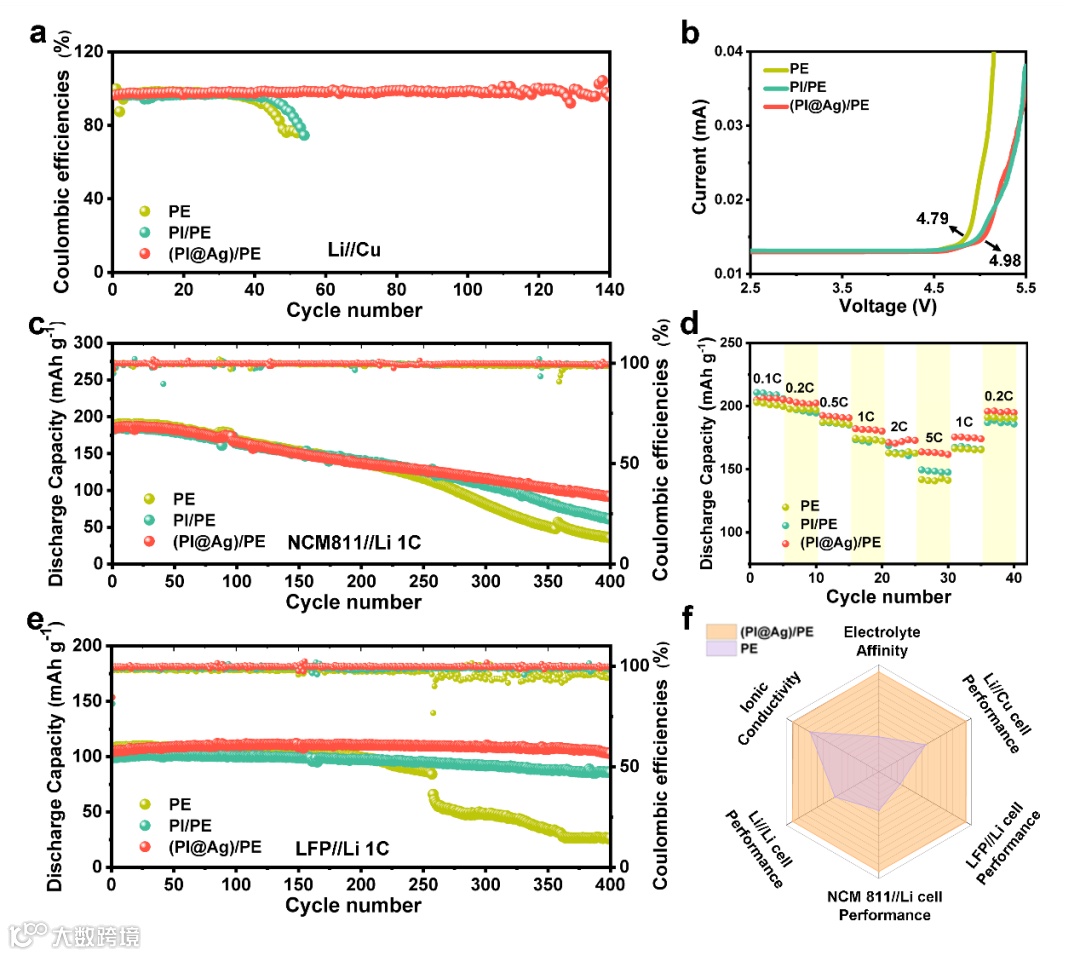 在Li//Cu电池中,PI@Ag功能隔膜能够稳定循环140圈,库伦效率维持在将近100%,而PE隔膜仅在循环40圈后出现了明显的库伦效率下降。最后,我们分别在NCM811//Li电池和LFP//Li电池中验证了PI@Ag功能隔膜出色的长循环性能和高容量保持率。