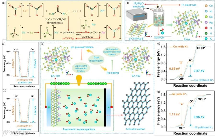 提出了一种创新的双向动力学优化机制并进行了验证。通过银的负载实现了对电容贡献反应促进,降低了钴和镍位点氧化还原反应的能垒。同时,通过钾离子预嵌入成功实现了对OER副反应的抑制,增大了钴和镍位点催化OER副反应OER的能垒。