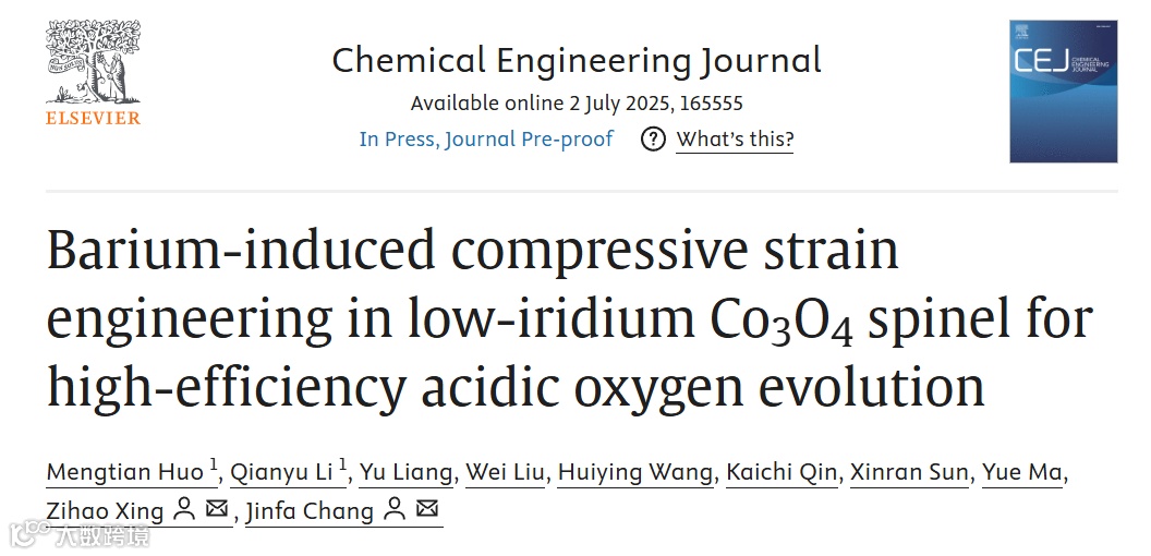 近日,东北师范大学邢子豪与常进法教授团队在知名期刊Chemical Engineering Journal发表题为“Barium-Induced Compressive Strain Engineering in Low-Iridium Co3O4 Spinel for High-Efficiency Acidic Oxygen Evolution”的研究论文。该工作通过电沉积法合成低铱含量(1.5 at.%)的Co3O4尖晶石催化剂(IrBa-Co3O4),利用钡(Ba)掺杂引入压缩应变,优化铱活性位点并抑制其聚集。在0.5 M H₂SO₄中,该催化剂仅需249 mV过电位即可达到10 mA cm⁻²电流密度,并稳定运行100小时,性能超越多数已报道尖晶石型催化剂。