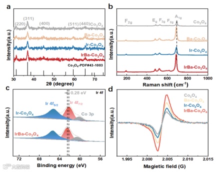 2.晶格参数从纯Co₃O₄的0.6914 nm降至IrBa- Co3O4的0.6877 nm,压缩应变达-0.37%(图2a)。