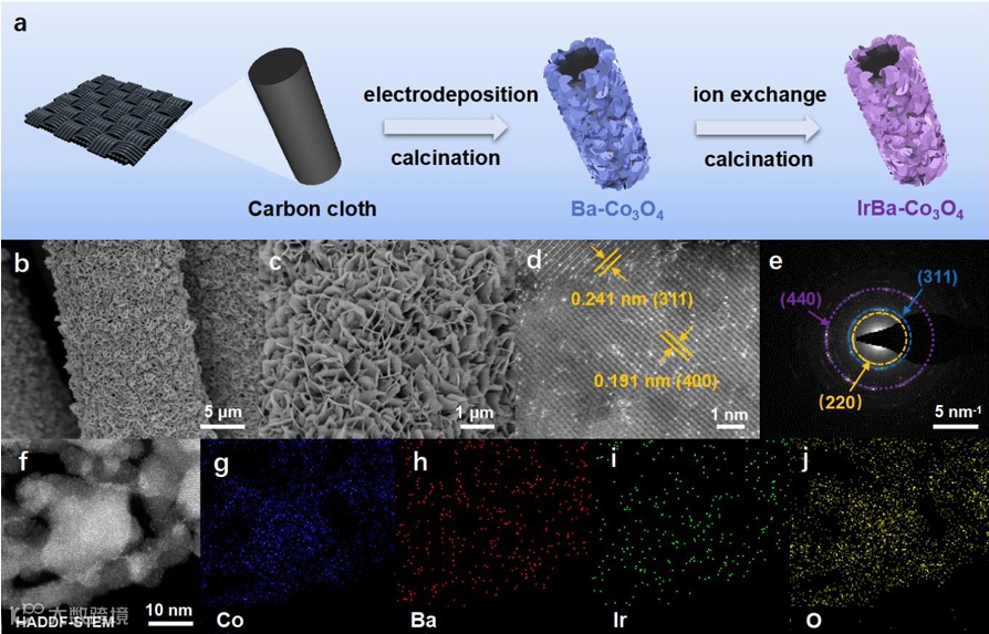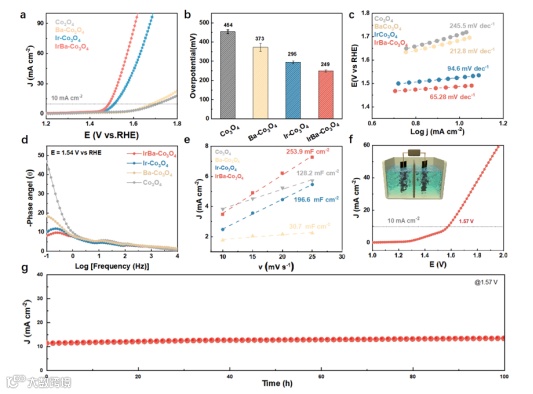 1.电化学测试表明:IrBa-Co3O4在10 mA cm-2和100 mA cm-2的过电位分别低至249 mV和389 mV(图4a),塔菲尔斜率仅65.28 mV dec⁻¹(图4c)。