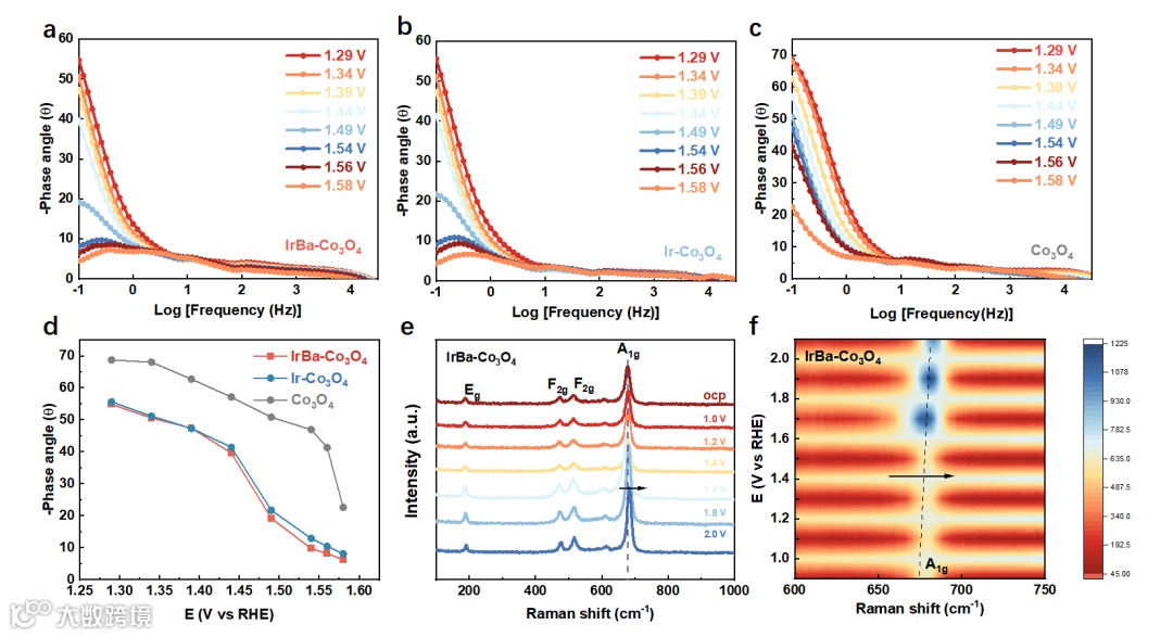 3.原位EIS和拉曼光谱证实:压缩应变缩短Cooct-O键,优化Ir-O-Ba/Co配位(图5),减少晶格氧流失。