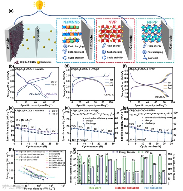 图6:a) 不同全电池的示意图。b) CF@Cu3P-CQDs║P2-NaMNNb全电池在25℃和-40℃下0.2C之间的1.5-3.8V的初始充放电曲线。c) 全电池的倍率性能。d) CF@Cu3P-CQDs║NVP@C全电池在0.2C下2-3.7V的1至3次充放电曲线。e) 全电池的倍率性能。f) CF@Cu3P-CQDs║NFPP全电池在0.2C下1至4.15V的前三圈充放电曲线。g) 全电池的倍率性能。h) 所制备全电池与已报道的全电池的Ragone图。i) 所制备全电池与已报道全电池的初始库仑效率和能量密度对比。