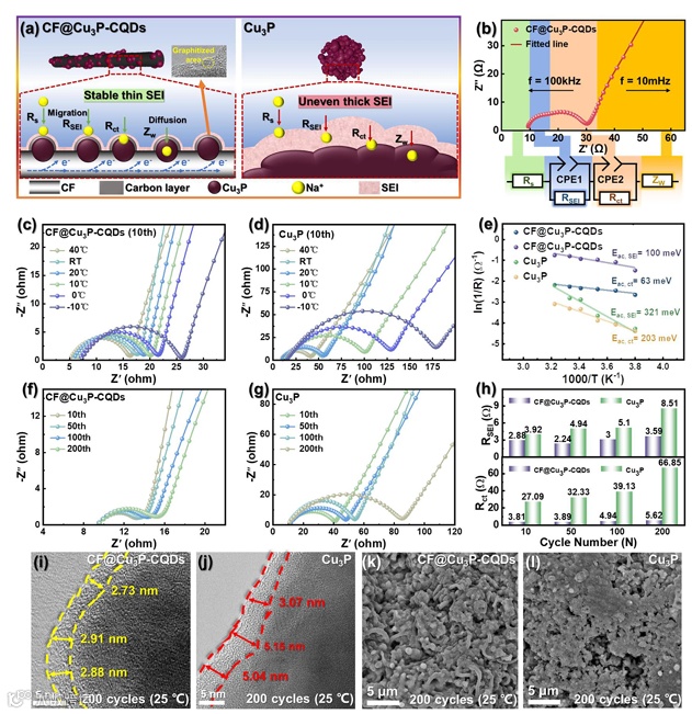 图4:a) CF@Cu3P-CQDs和Cu3P界面阻抗过程的示意图。b) CF@Cu3P-CQDs的Nyquist图及对应的等效电路。c,d) CF@Cu3P-CQDs和Cu3P的温度依赖性Nyquist图。e) 从CF@Cu3P-CQDs和Cu3P的Nyquist图计算得到的Rct和RSEI的Arrhenius曲线及计算得到的活化能。f,g) CF@Cu3P-CQDs和Cu3P在不同循环次数下的Nyquist图。h) CF@Cu3P-CQDs和Cu3P电极在循环过程中的RSEI和Rct演变。i,j) CF@Cu3P-CQDs和Cu3P经过200次循环后的透射电子显微镜(TEM)图像。k,l) CF@Cu3P-CQDs和Cu3P经过200次循环后的扫描电子显微镜(SEM)图像。