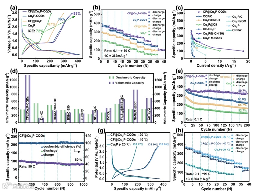 图3:a)0.1C(1C = 363mAh·g-1)下0.01至3V之间的初始充放电曲线。b) 0.1C–50 C的倍率性能。c)与其他已报道的基于Cu3P的负极材料的倍率性能对比。d) CF@Cu3P-CQDs与其他已报道负极材料的质量/体积比容量对比。e) 样品在0.1C(经过5个0.1C循环后)的循环稳定性。f) CF@Cu3P-CQDs在50C(经过5个0.1C循环后)的循环稳定性。在-20/-40℃下对CF@Cu3P-CQDs进行电化学测试:g) 0.1C下的初始充放电曲线,h) 倍率性能。