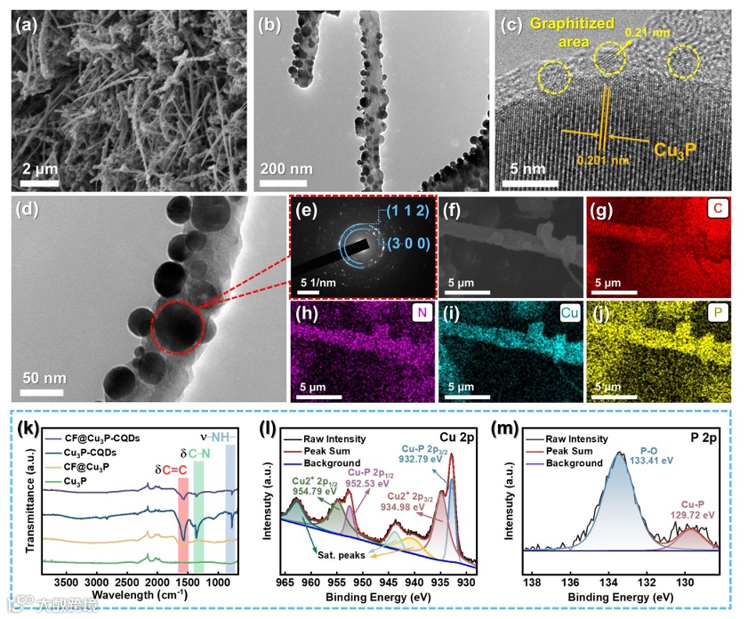图2:a) CF@Cu3P-CQDs的扫描电子显微镜(SEM)图像。b) CF@Cu3P-CQDs的透射电子显微镜(TEM)图像。c) CF@Cu3P-CQDs的高分辨率透射电子显微镜(HRTEM)图像。d) CF@Cu3P-CQDs上Cu₃P纳米颗粒的TEM图像及对应的e) 选区电子衍射(SAED)图谱。f) CF@Cu3P-CQDs的SEM图像及对应的g–j) 能量色散图谱(EDS)元素分布图,分别为C、N、Cu和P元素。k) CF@Cu3P-CQDs、Cu3P-CQDs、Cu3P-CQDs和Cu3P的傅里叶变换红外图谱(FT-IR)图。l) C1s和m) N1s的窄扫描X射线光电子能谱(XPS)图及对应的拟合曲线。