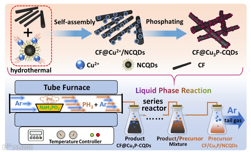 绿色合成方法:采用液相磷化法合成CF@Cu3P-CQDs,该方法通过将PH₃气体引入液相反应器中,与CF/Cu2+/NCQDs悬浮液进行连续反应,实现了零污染和高产率。传统方法通常会产生有毒的PH₃尾气,而本方法通过完全利用PH3,避免了尾气排放。